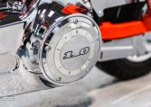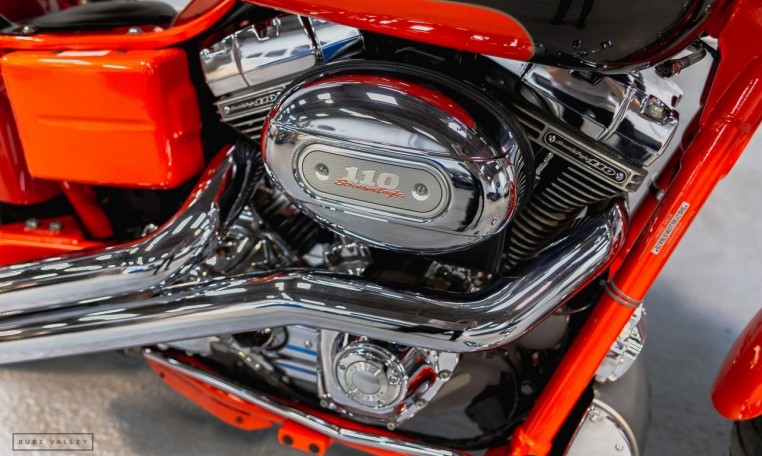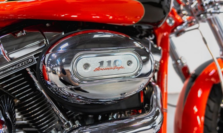 Rubber-mounted, air-cooled, Screamin’ Eagle Twin Cam 110 engine with chrome finish